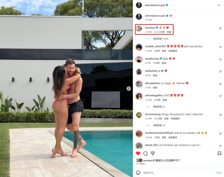安东内拉发布5分钟后,梅西也现身评论区,用一串表情评论:“🔥🔥❤️”