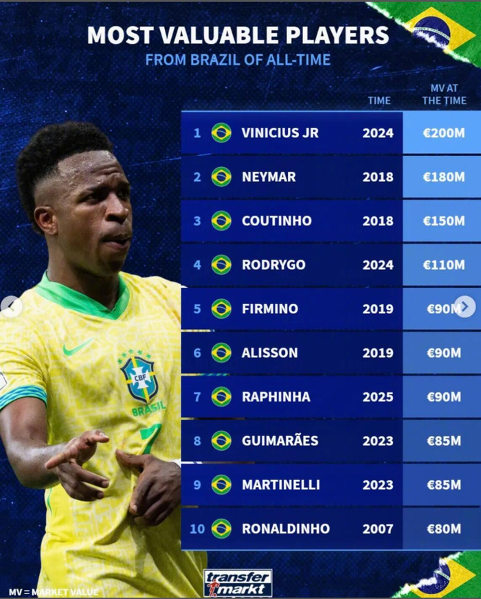 维尼修斯在2024年时身价达到最高的2亿欧排名第一;2018年的内马尔以1.8亿排名第二;2018年的库蒂尼奥以1.5亿排名第三;2007年的小罗以8000万排名第十。