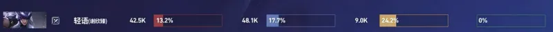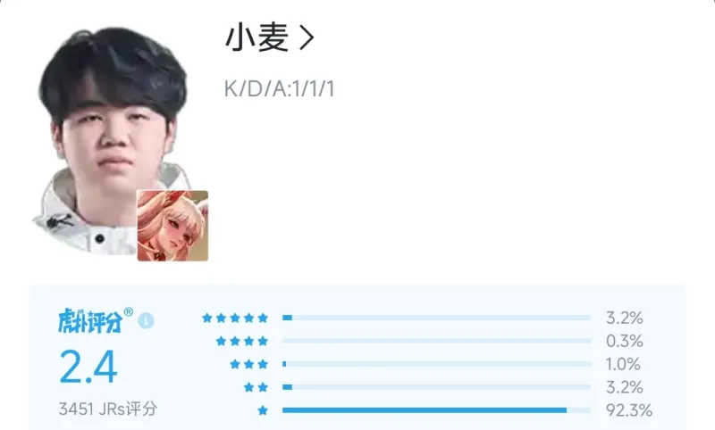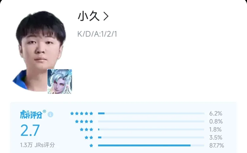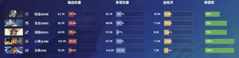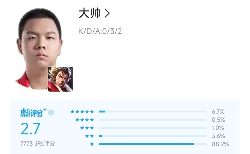 对阵北京WB的比赛,一局马超一局关羽合砍0-3-0。吃24.2%的经济打13.2%的输出占比,像极了大伙路人局排到的绿牌马超。